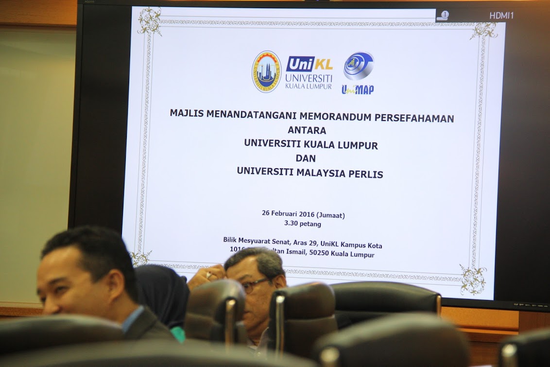 Universiti Malaysia Perlis (UniMAP) dan Universiti Teknikal Mara Sdn Bhd (UniKL) menandatangani memorandum persefahaman (MoU) pada 26 Februari, baru-baru ini.