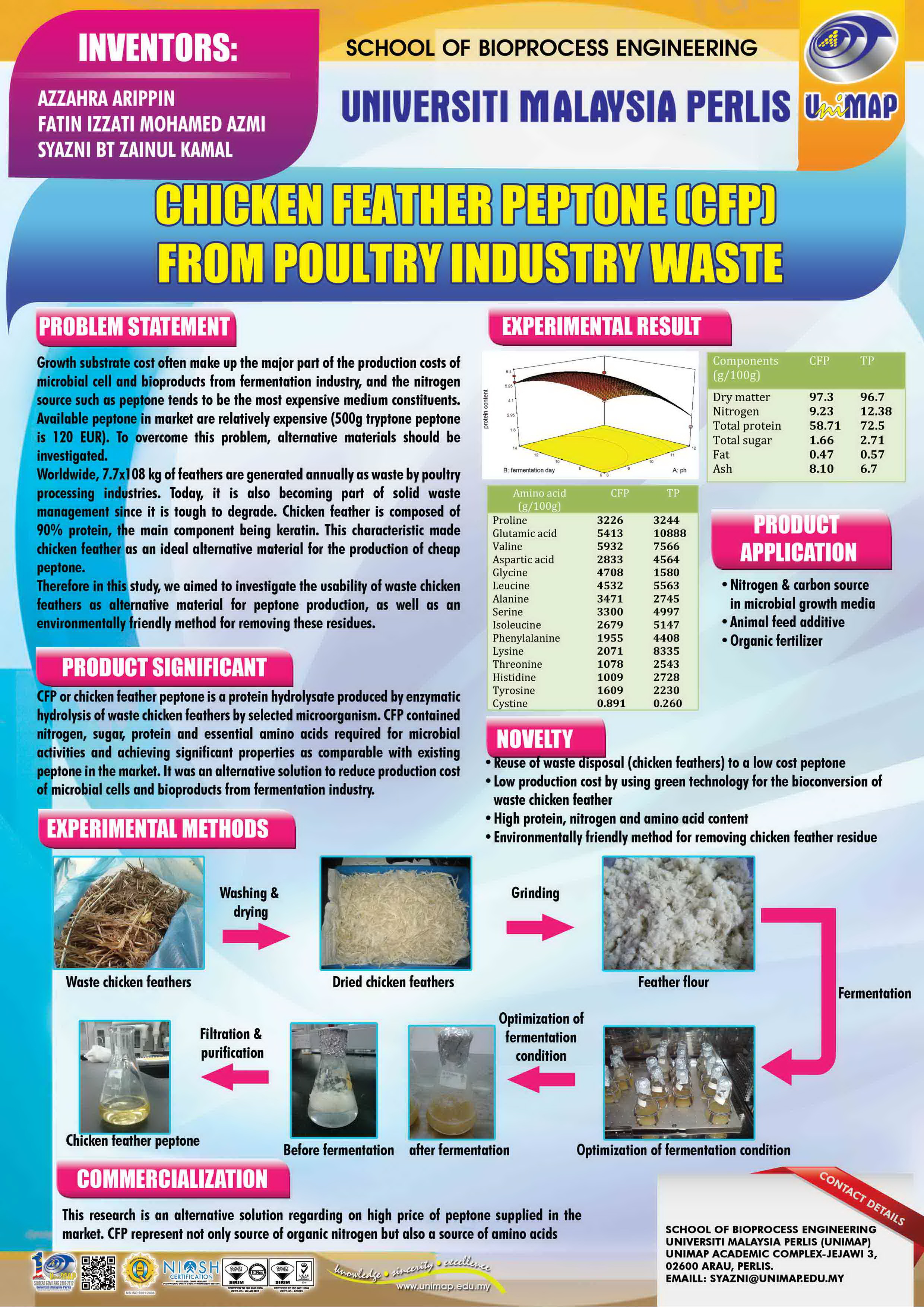 The study is to investigate the usability of waste chicken feathers as an alternative materials for peptone production, as well as an environmentally friendly methods for removing residues.
