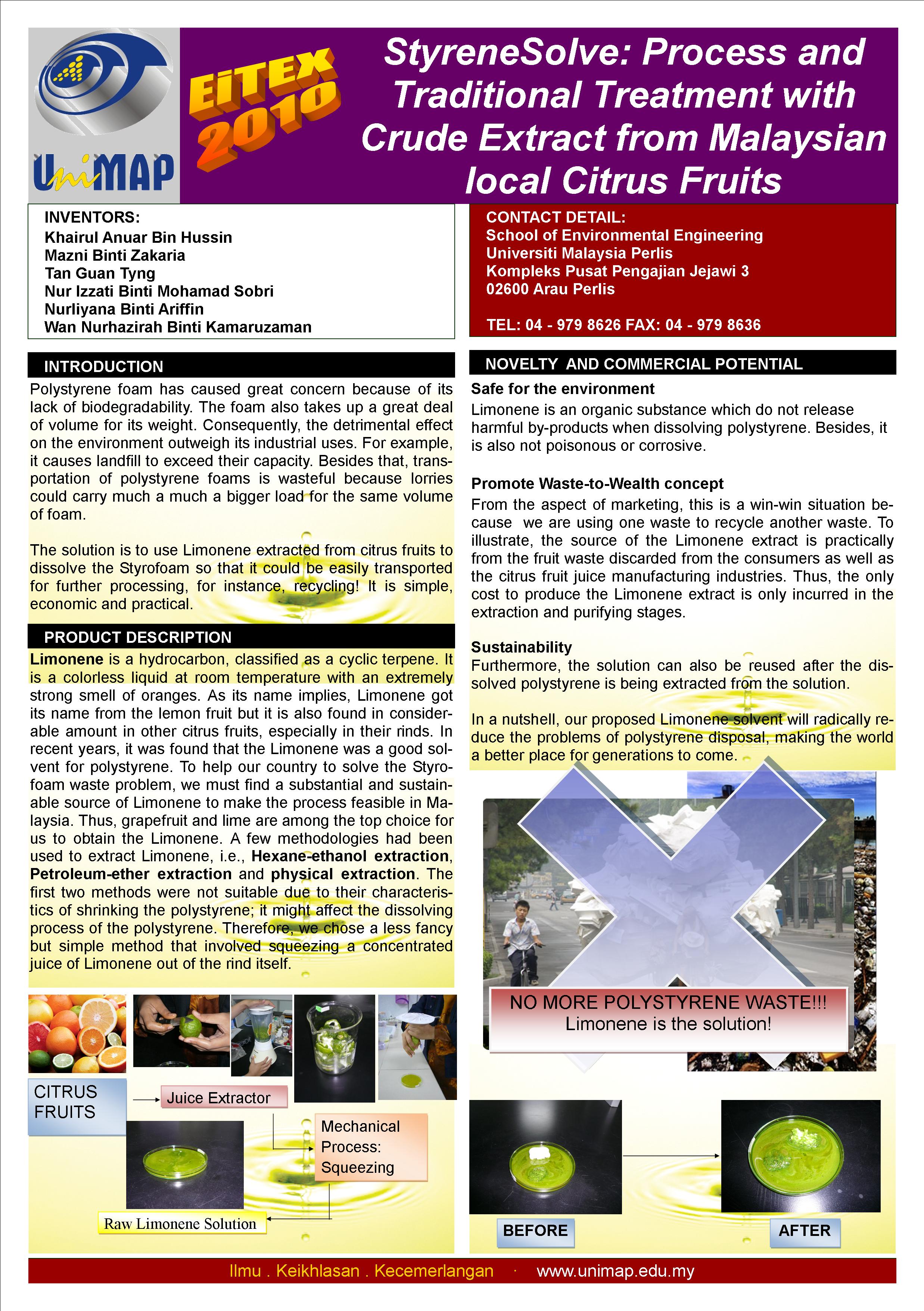 StyreneSolve: Process and Traditional Treatment with Crude Extract from Malaysian local Citrus Fruits